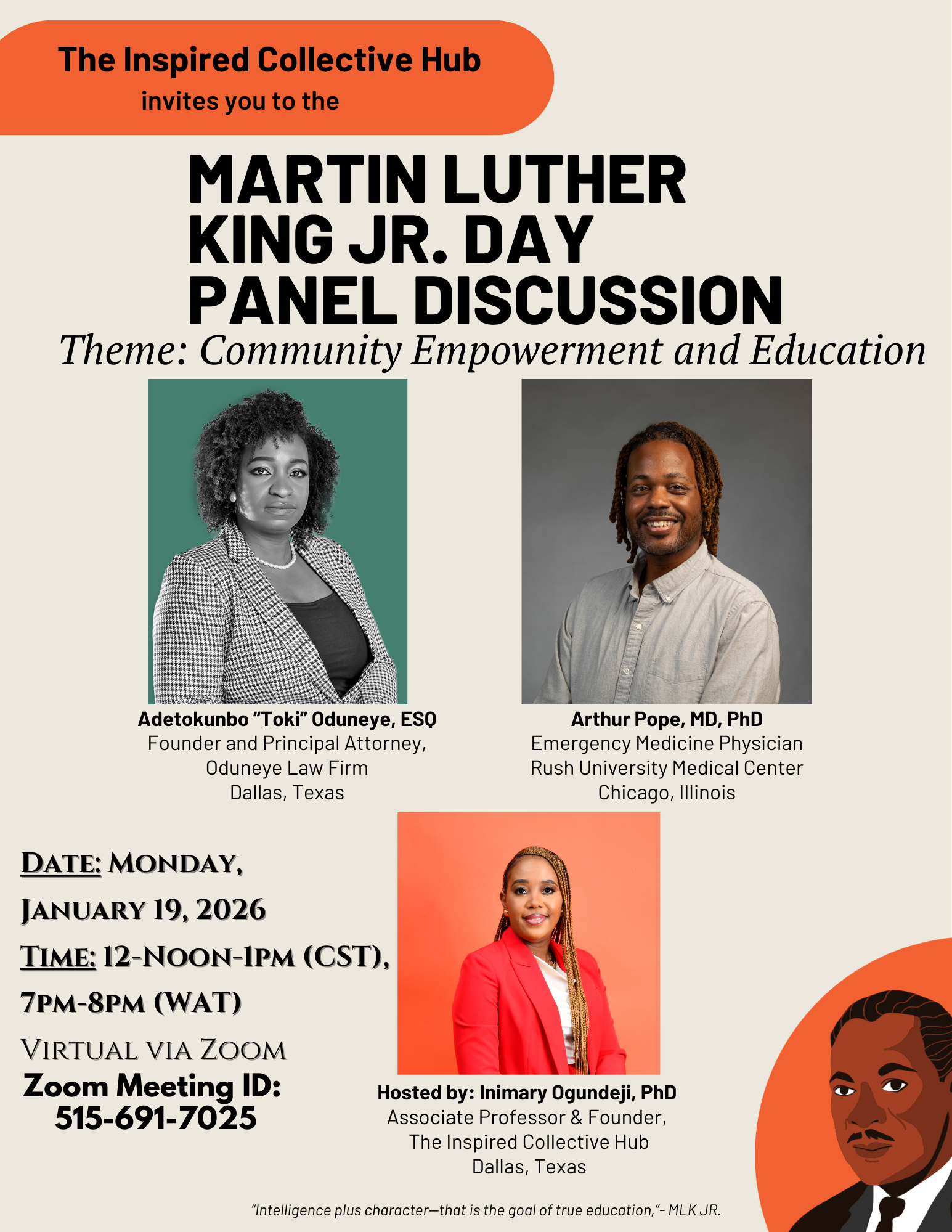 Join us for a meaningful conversation as we honor the legacy of Dr. Martin Luther King Jr. through dialogue, reflection, and action. This upcoming panel discussion will explore leadership, service, and the ongoing work of justice and community empowerment.